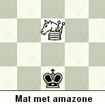 Dit is een amazone.![]() Een amazone is een dame op een paard. Dit superschaakstuk gaat als een dame óf als een paard. Je mag dus kiezen of je met de amazone een paardzet of een damezet doet. Ook wanneer je de amazone als dame gebruikt en zó neerzet dat de koning van de tegenstander op een paardafstand komt te staan, dan staat die koning schaak. De amazone is een gevaarlijk stuk. Zij kan in haar eentje de koning schaakmat zetten op een leeg bord. ![]() ![]() Een ander stuk is de keizerin. Dit stuk gaat als een toren óf als een paard. Er zijn nog meer superschaakstukken. Zo heb je de veteraan, de prinses, de heraut, en er zitten ook romantische typetjes bij: de baron en de femme fatale. Leuke stukken. En dan heb je nog een giraffe en de renpionnen. Je zou natuurlijk ook best stapionnen kunnen bedenken. Inderdaad, je kunt het zo gek niet maken of het bestaat in superschaak. Ik ga al die stukken niet allemaal uitleggen want ik snap er zelf nog maar twee. Als je meer wilt weten, ga dan naar de website van de heer Henk van Haeringen, die superschaak bedacht heeft. Ik heb al meteen een idee voor een aardig nieuw stuk. Dat is de loodgieter. Een stuk dat heel veel kan - dit in overleg met de tegenstander. Een nadeel van de loodgieter moet zijn dat hij afdaalt in een put op het schaakbord waar hij niet geslagen kan worden en verder zelf ook niets kan, want hij is aan het klussen. De loodgieter mag pas weer bovenkomen als er acht zetten zijn gedaan of als de loodgieter van de tegenpartij een zet doet, die dan op zijn beurt acht uur in de ondergrondse put verdwijnt. Maar alle gekheid op een stokje. Hieronder staan 12 matpuzzels met amazone (dame + paard) en keizerin (toren + paard). Het is steeds mat in 1. Over de oplossingen wordt niet gecorrespondeerd. |
